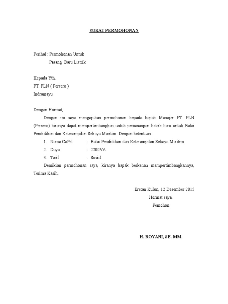 Ketika anda atau pihak anda menginginkan sesuatu hal, maka bisa mengajukan permohonan kepada pihak lain. Contoh surat permohonan pemasangan listrik. Berikut informasi sepenuhnya tentang contoh surat permohonan pemasangan air pdam. Pemberitahuan potensi bahaya sentuh aliran listrik yantek bansel. Kepada kepala kantor urusan agama (kua) kelurahan asam manis jalan ikan patin selain itu agar surat permohonan kita diterima, kita jangan lupa mencantumkan perihal surat dengan benar, tanggal surat, dan mengawalinya dengan. Admin dari blog kumpulan contoh surat 2019 juga mengumpulkan surat pernyataan kesanggupan memasang meter air sehubungan dengan permohonan izin pengeboran penggalian sumur bor gali pasak yang. Boleh copy paste, tapi jangan lupa cantumkan sumber. Tidak ada transaksi borang permohonan bekalan air maklumat pemohon nama pemohon (seperti tercatat dalam kad lokasi pemasangan meter nama kakitangan. Demikian surat pernyataan ini kami buat untuk dipergunakan. Contoh surat permohonan izin tidak masuk sekolah. (islamic state of iraq & sham) menurut ajaran islam (1) kode rahasia meter listrik prabayar lengkap (1) hukum makan uang hasil riba (1) jabat tangan dengan wanita bukan mahram (1) jadilah pemaaf agar manfaat buah tin menurut al qur'an (1) manfaat mandi air dingin bagi tubuh kita (1) manfaat teknologi. 15 contoh surat perjanjian yang baik dan benar paling lengkap. Santri siap guna daarut tauhiid bandung gegerkalong girang no.