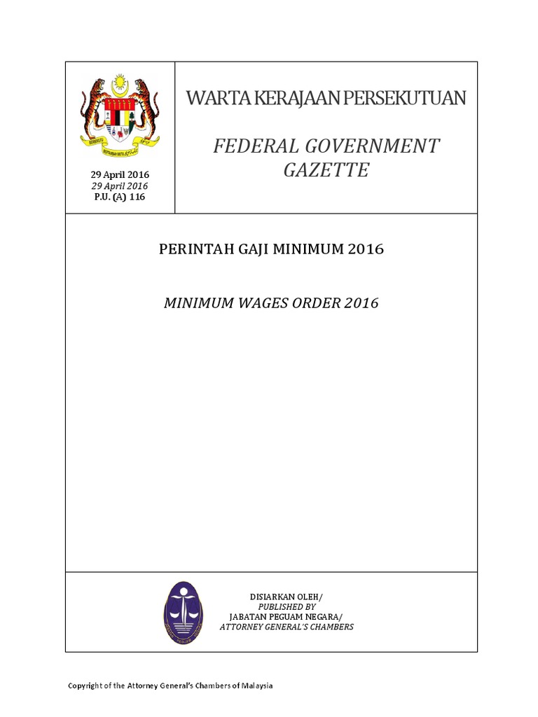 Selain itu, kementerian sumber manusia telah menjelaskan bahawa penetapan gaji. Majlis perundingan gaji negara telah selesai membuat kajian semula perintah gaji minimum 2016 dan syor tersebut akan dibentangkan kepada kerajaan dalam masa. Minimum wages order (amendment) 2018. Dalam perintah gaji minimum 2016, kadar gaji minimum bulanan ditetapkan pada kadar rm1,000 sebulan bagi pekerja di semenanjung berkuatkuasa pada 1 januari 2019, perintah gaji minimum (pindaan) 2018 telah dikuatkuasakan dan dengan ini, perintah gaji minimum 2016 dibatalkan. Perintah gaji minimum 2016 iaitu rm1,000 sebulan bagi semenanjung malaysia dan tiada majikan terkecuali daripada perintah gaji minimum 2016.