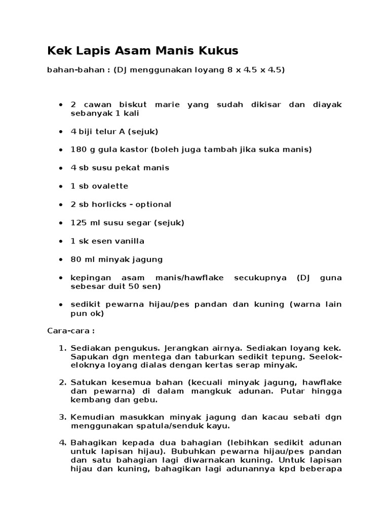 Kek lapis asam manis reviewed by mat gebu on 4/26/2008 04:01:00 pm rating: Rasa masam manis akan terasa setiap kali makan kek ini. Resipi sedap dan mudah untuk kek lapis masam manis. Selamat pengantin baru to siti. 300 gram biskut marie (cm guna jenama munchy's), dikisar halus dan diayak. Kelas kek lapis sarawak & tart; Kek lapis tradisi mmg kaler mcm ni,tp dyg saja buh 2 warna jer,ehhe bab malas nak melapis kaler maler,dah byk sgt melapis kek,kdg2 kaler tu konpuse plak,tu. Resepinya ada di dalam videoterima kasih 450 gram mentega (cm guna scs) 150 gram gula halus (cm letak 130 gram) 10 biji telur gred a. 2 1 2 cawan biskut lemak yang telah diblend. Kek lapis masam manis ni dah jadi favorite sejak ummi dapat resepi dari kawan sekolah masa tahun 1995. Kek lapis kukus masam manis. Cara buat resepi kek lapis masam manis sukatan cawan :