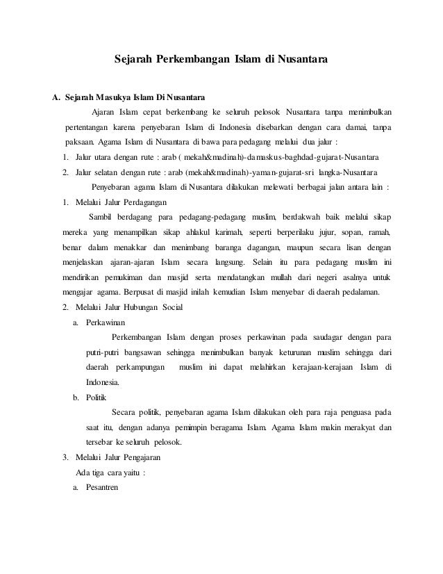 Perkembangan islam di nusantara (indonesia) makalah diajukan untuk memenuhi tugas mata kuliah sejarah pemikiran tasawuf di indonesia semester 1 dosen : Sejarah dan perkembangan islam di nusantara. Dalam makalah ini akan dibahas lebih mendalam mengenai sejarah perkembangan islam di indonesia. Proses masuk dan berkembangnya islam ke indonesia melalui jalur perdagangan melalui jalur perkawinan melalui jalur pengajaran melalui jalur kesenian. Adapun malaka dikenal sebagai pintu gerbang nusantara.julukan ini diberikan mengingat peranannya sebagai jalan.